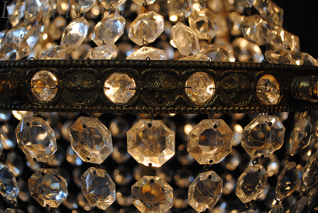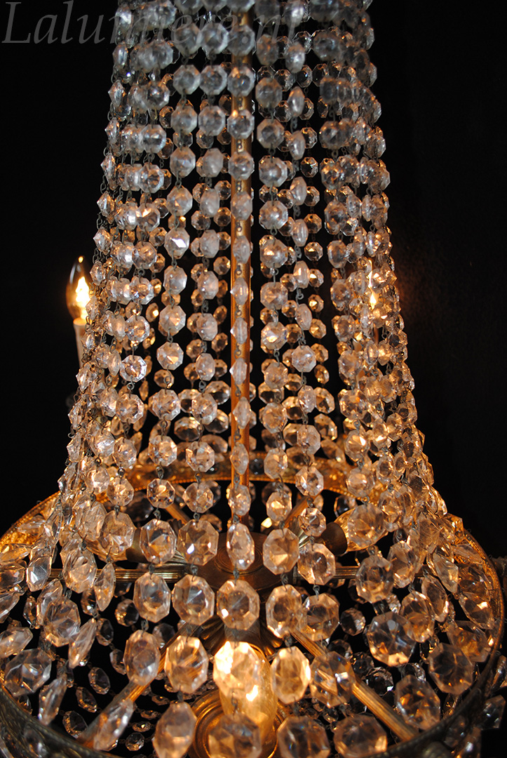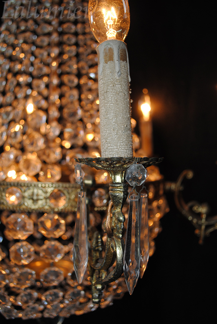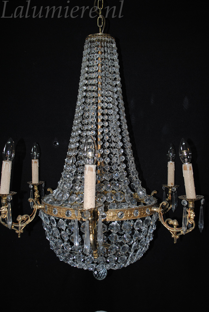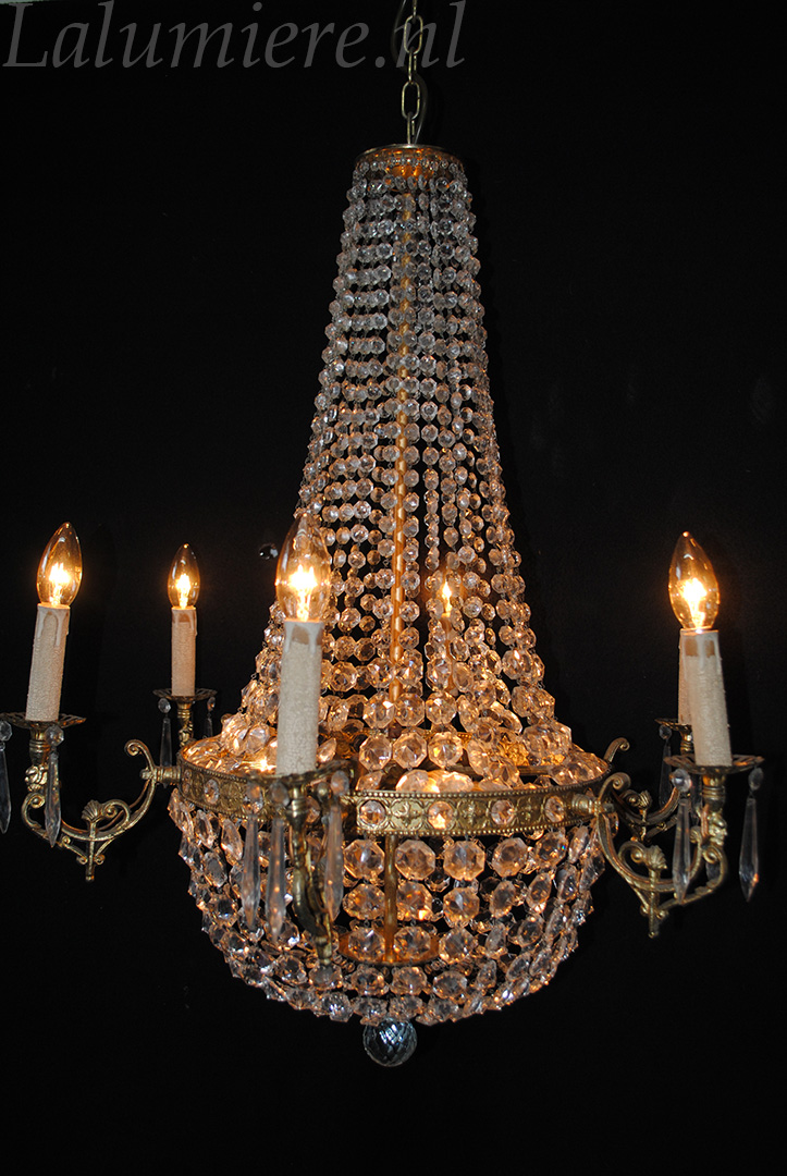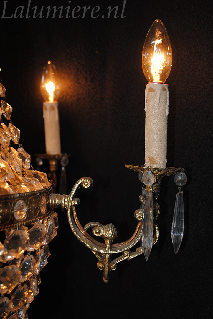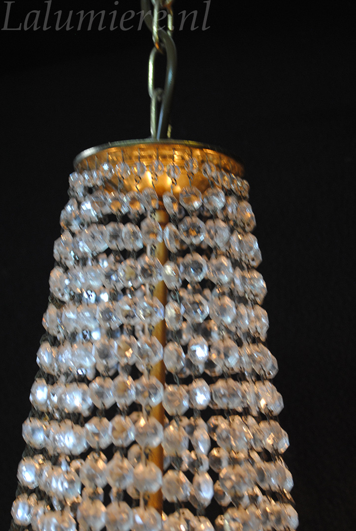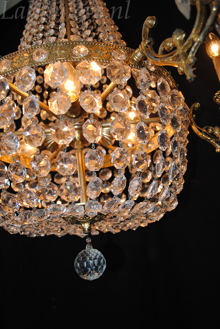 Mooie Zak kroon met 9 lichtpunten in totaal. 3 lichtpunten in het midden van de zakkroon en 6 lichtpunten aan de buitenkant.In de rand zijn ook facetgeslepen kralen verwerkt. Aan de schaaltjes hangen ijspegeltjes